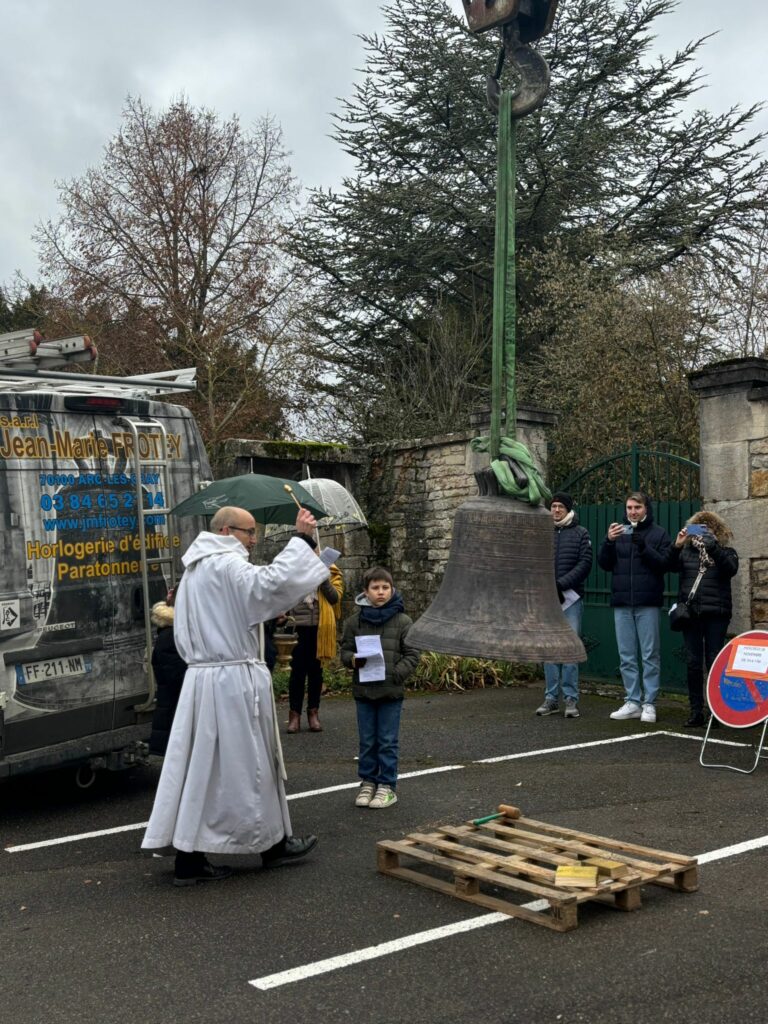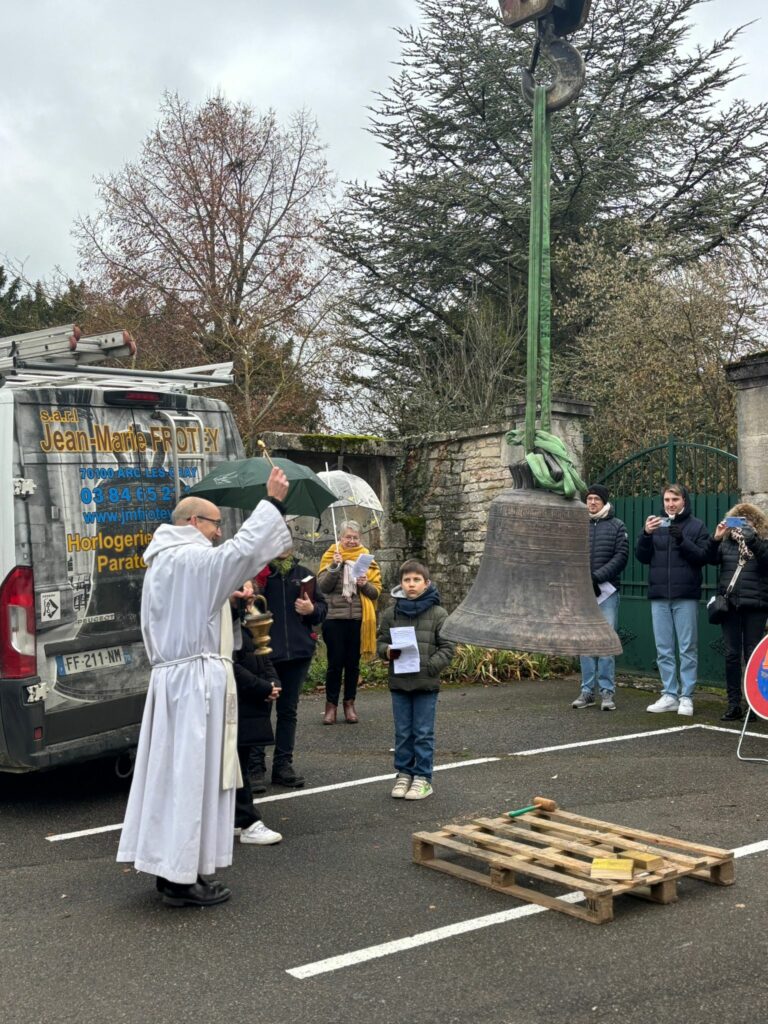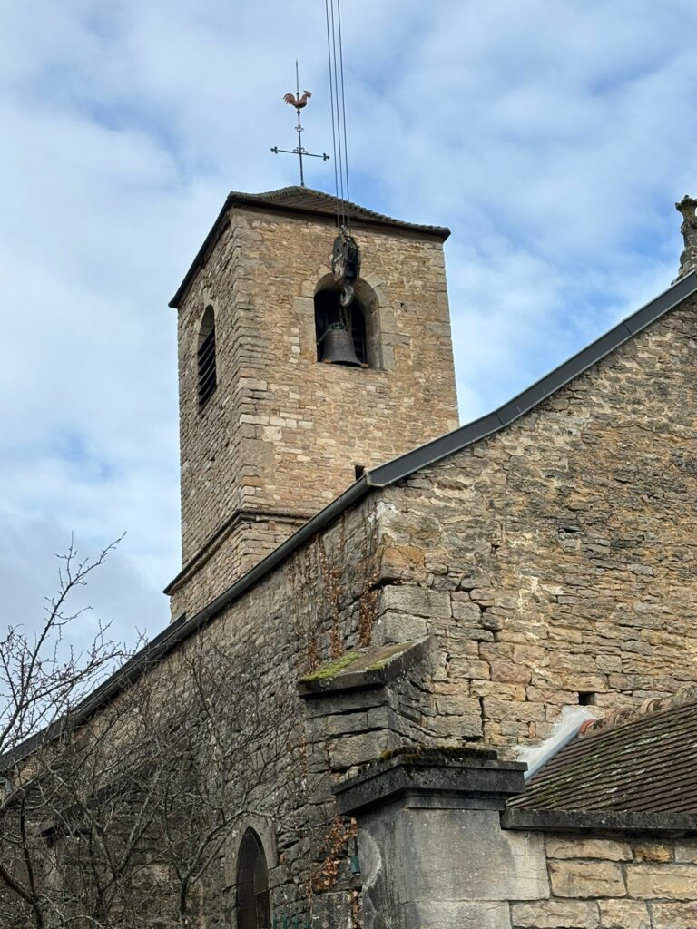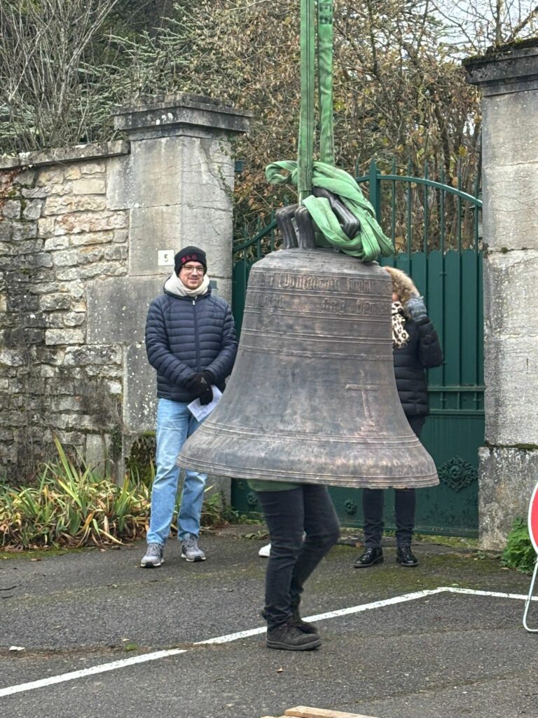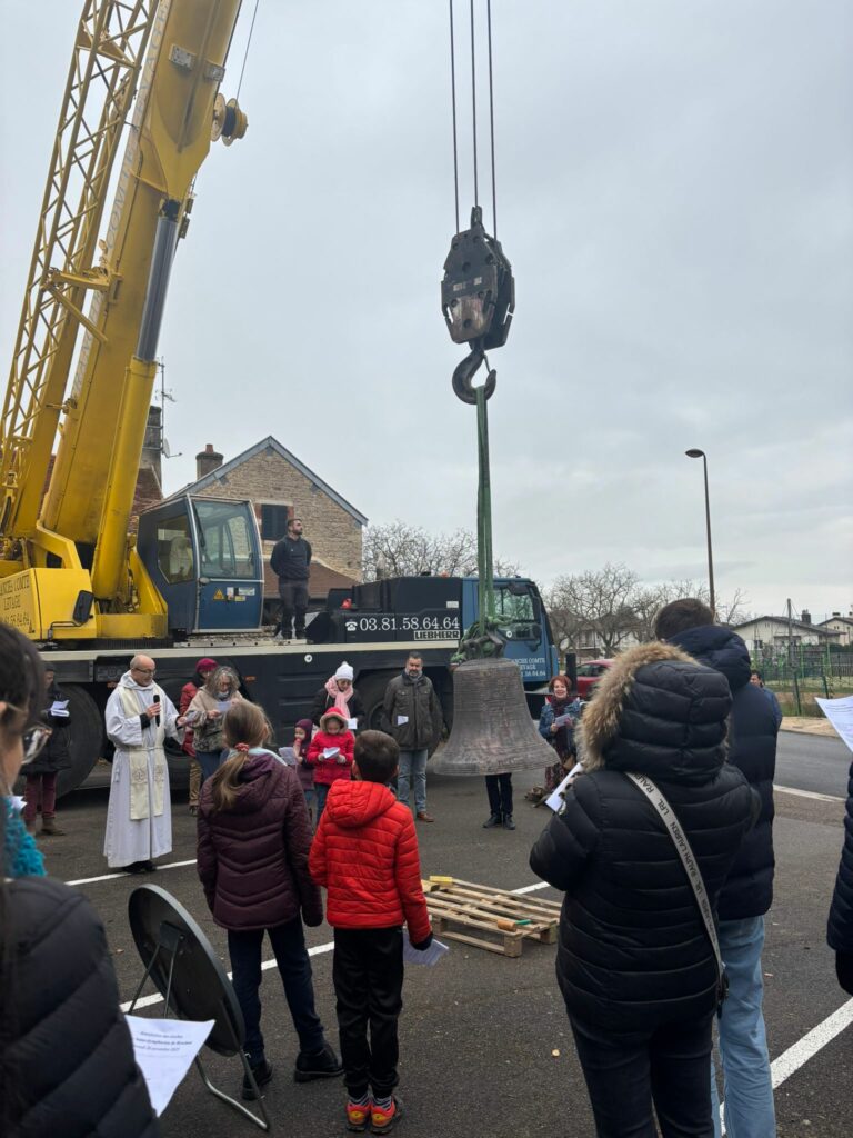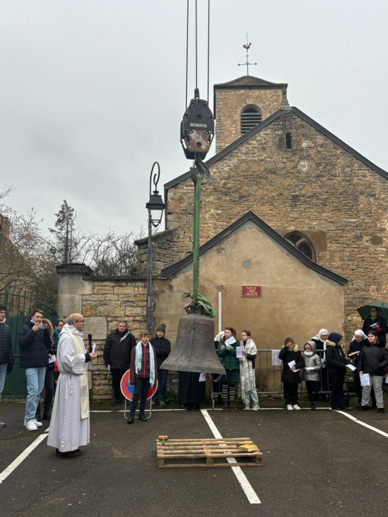 L’église de Brochon a retrouvé sa cloche sous l’oeil attentif des enfants du caté, de paroissiens et de curieux. Un beau moment sous le ciel bourguignon !