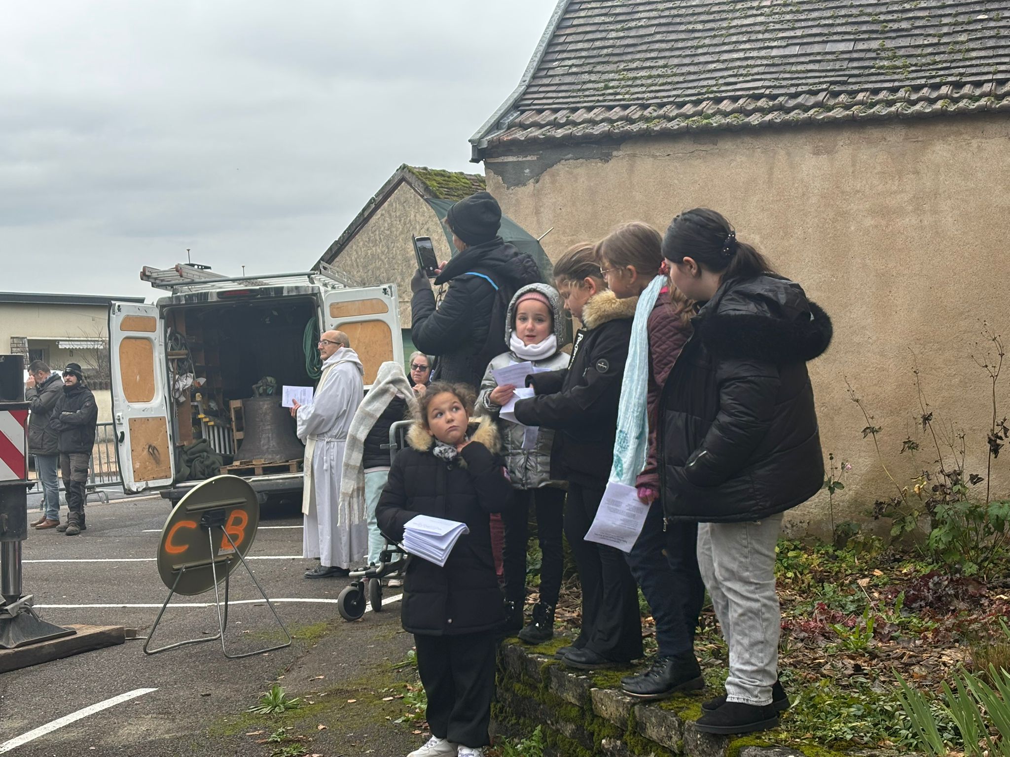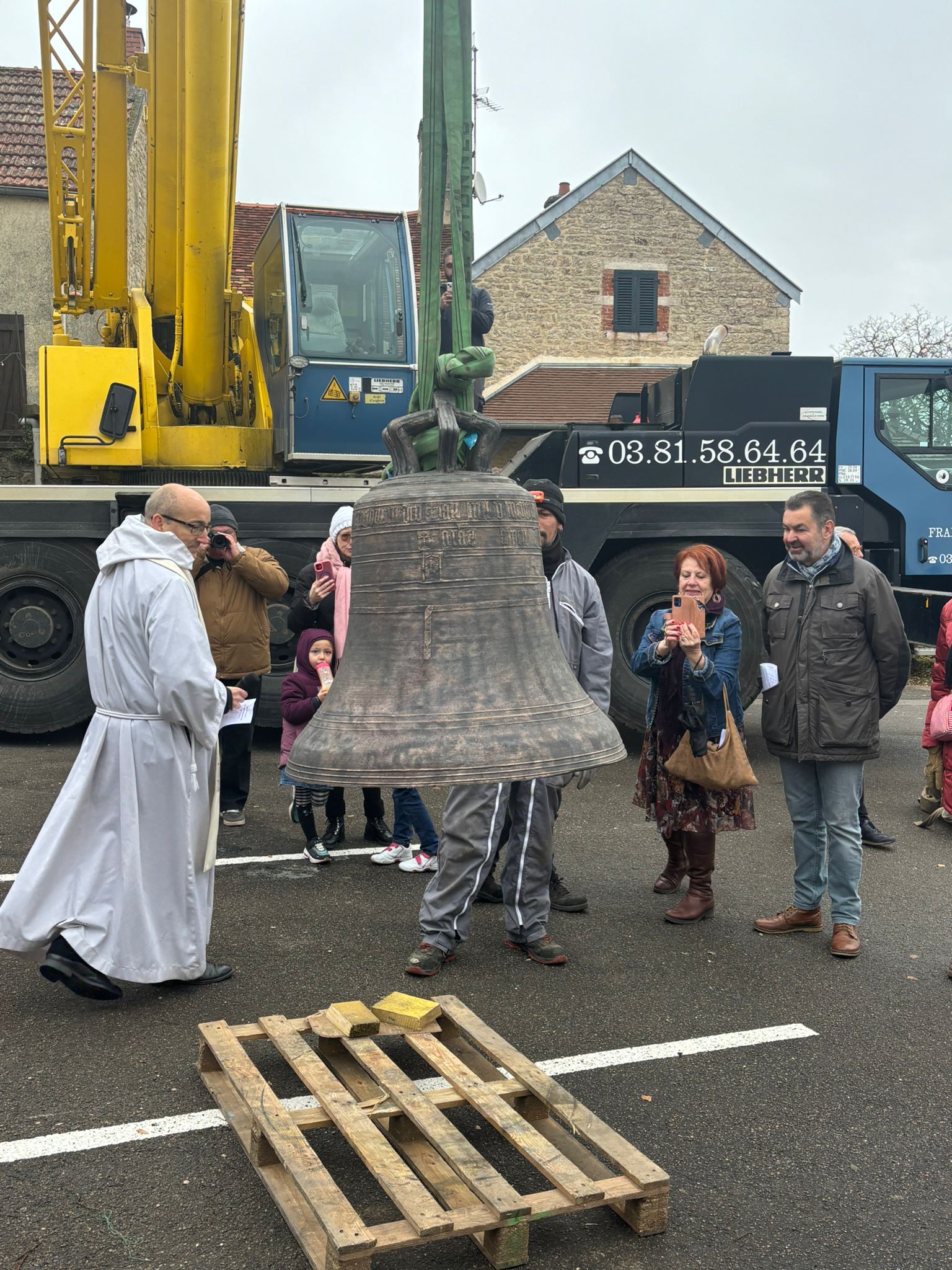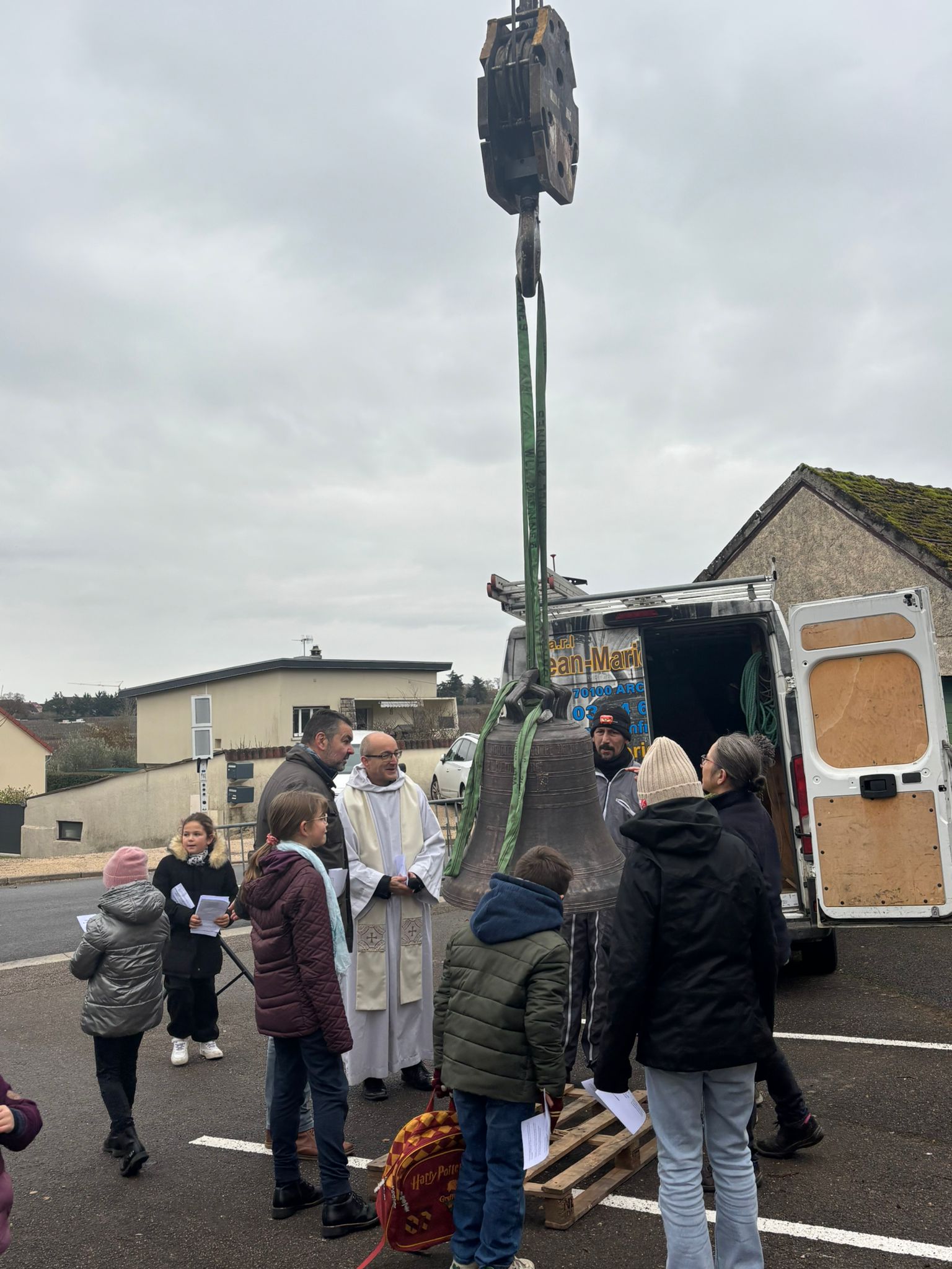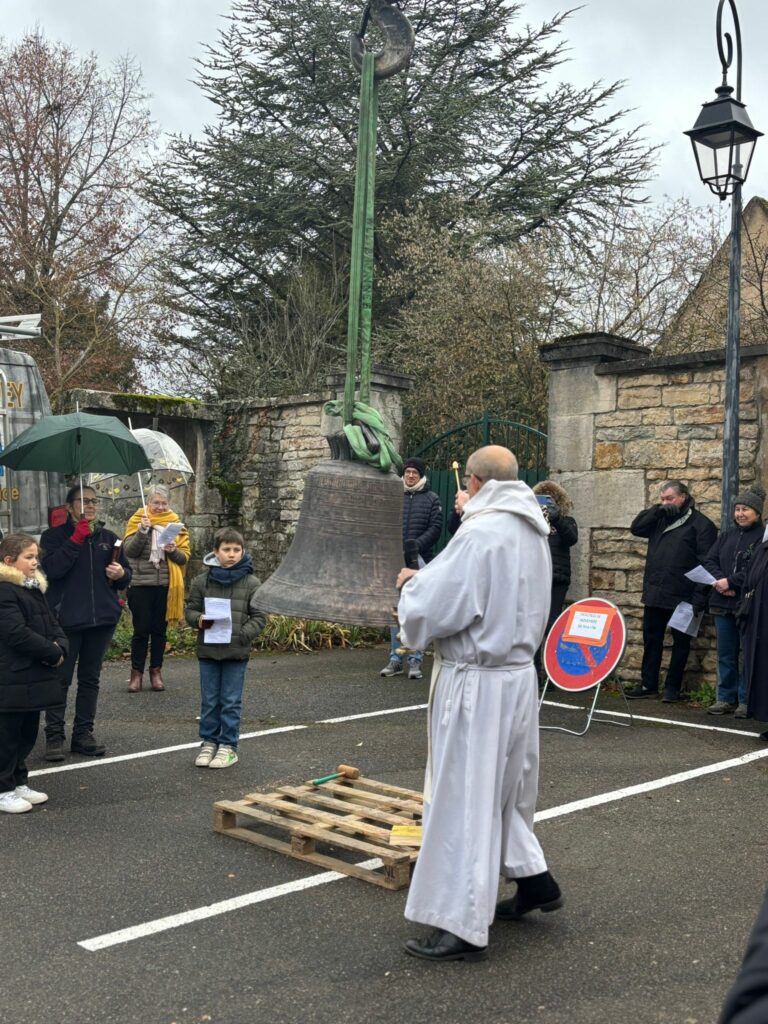 L’église de Brochon a retrouvé sa cloche sous l’oeil attentif des enfants du caté, de paroissiens et de curieux. Un beau moment sous le ciel bourguignon !