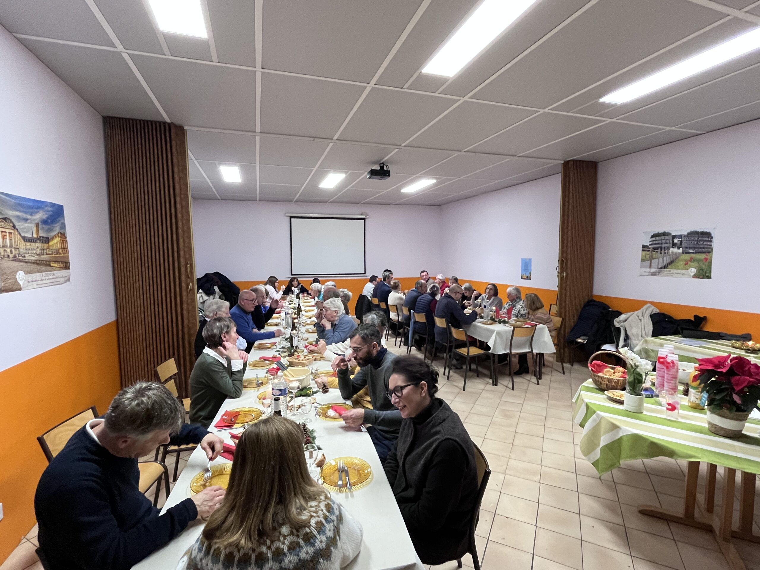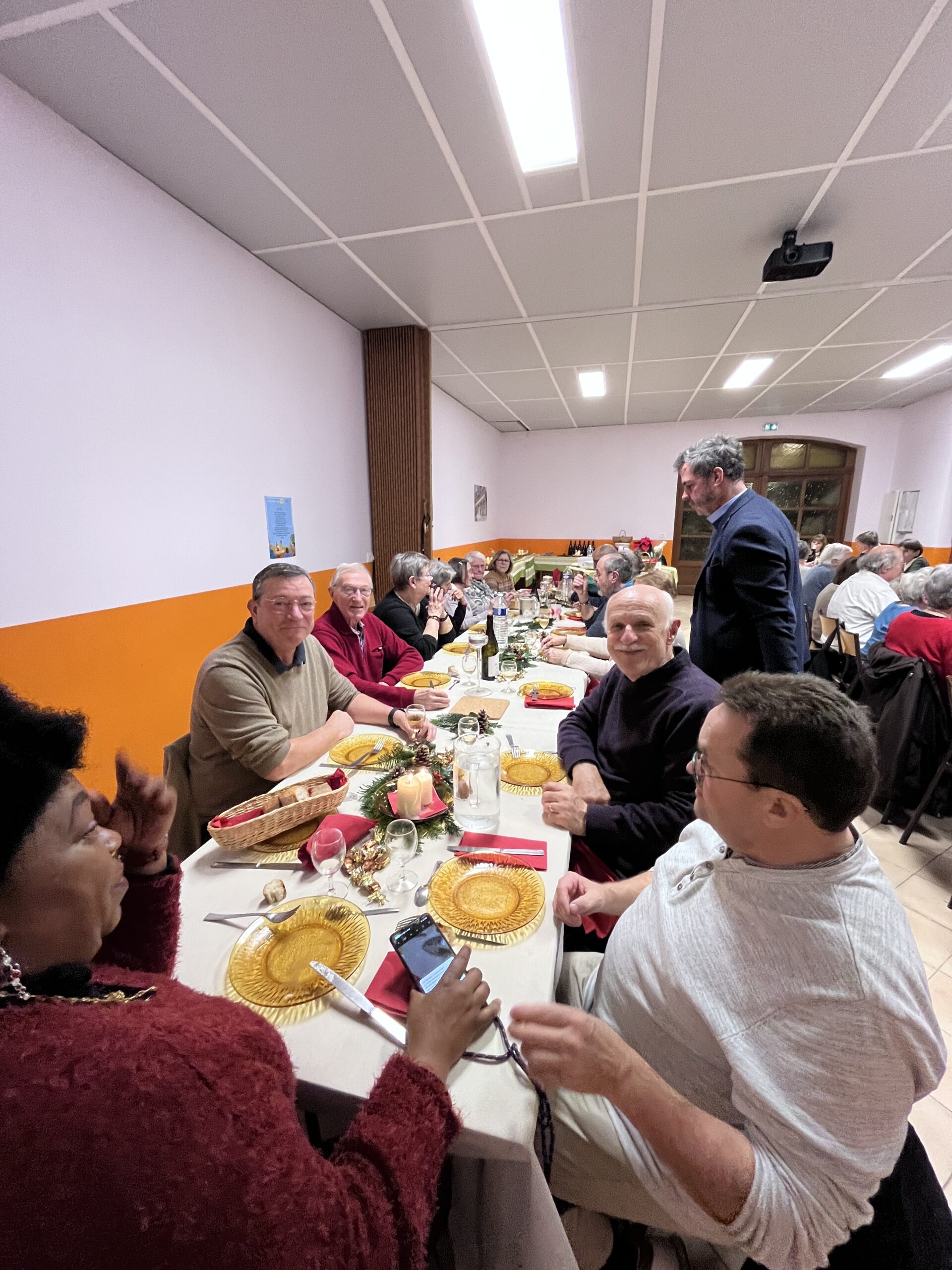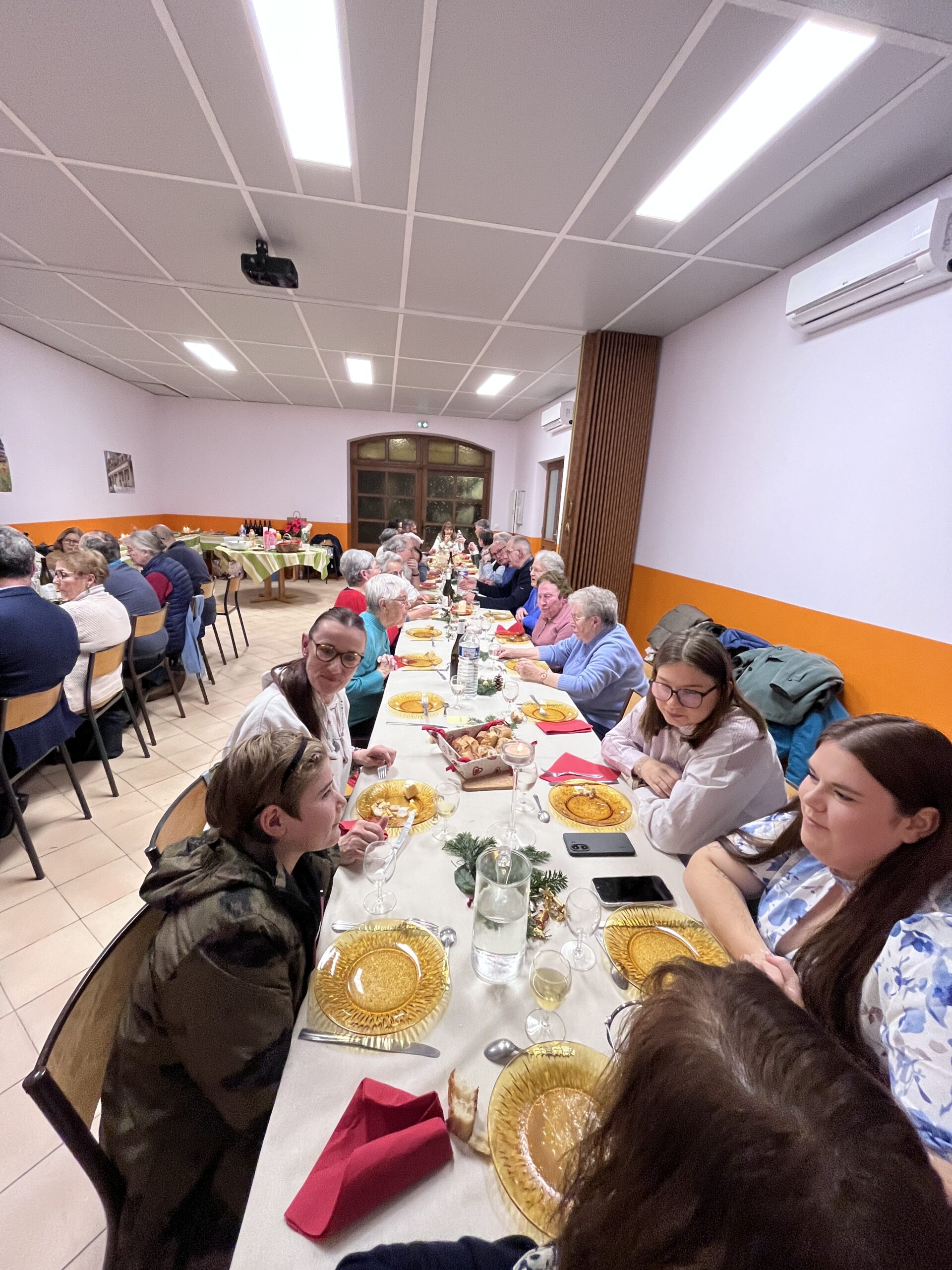Salades endives-noix-oranges, du poulet Gaston Gérard accompagné de son riz, les fromages Delin et les desserts maisons.
