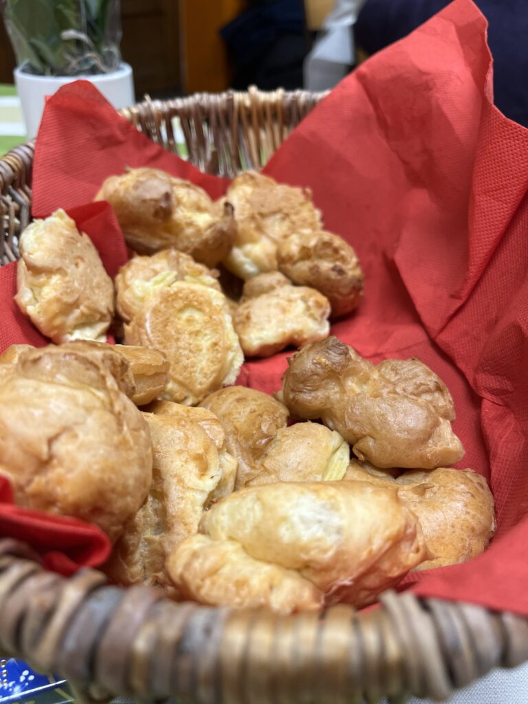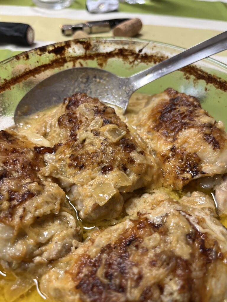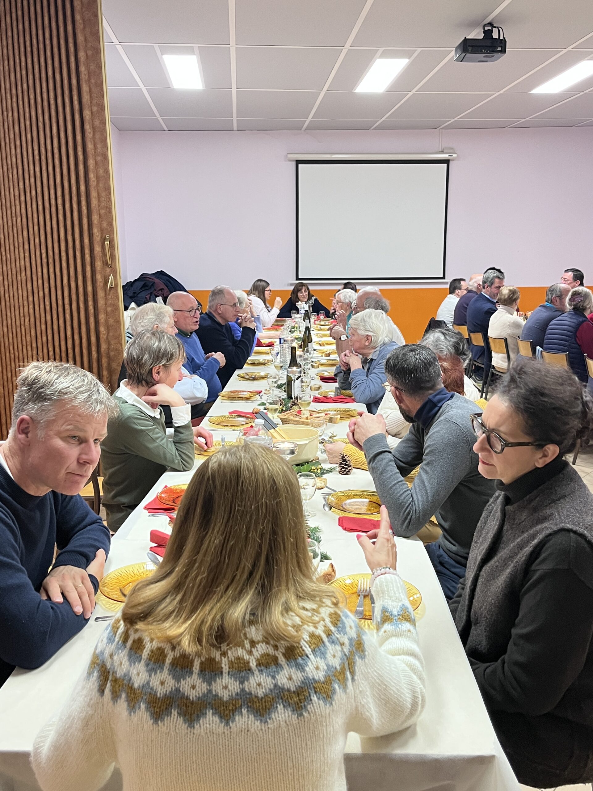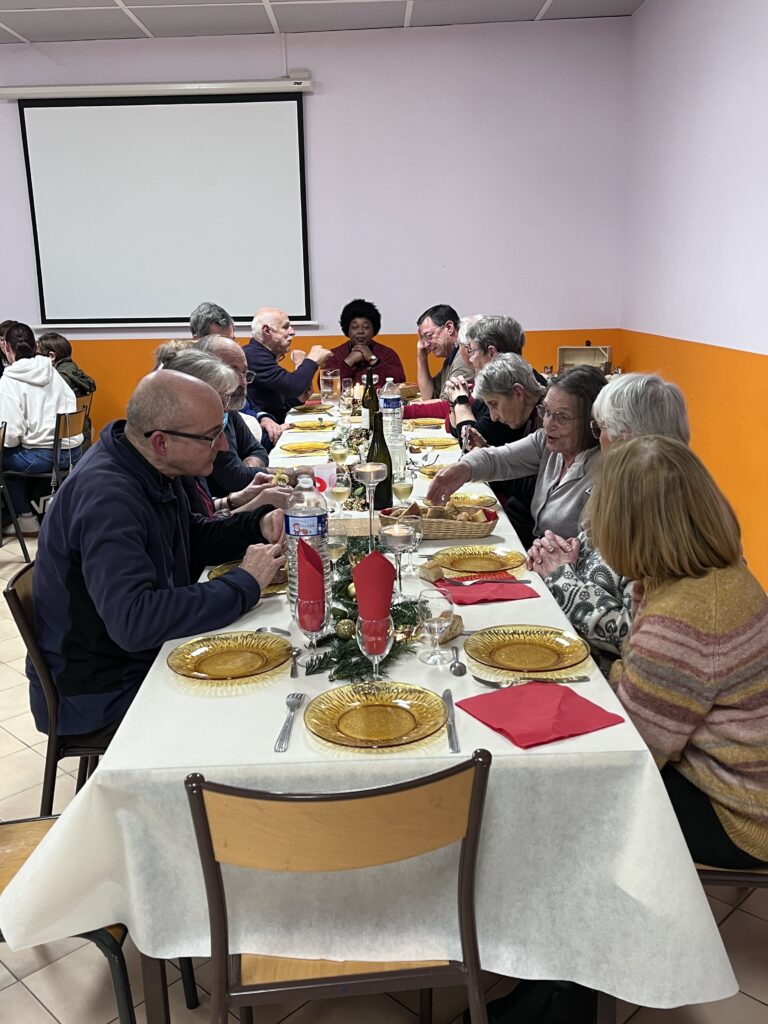 Salades endives-noix-oranges, du poulet Gaston Gérard accompagné de son riz, les fromages Delin et les desserts maisons.